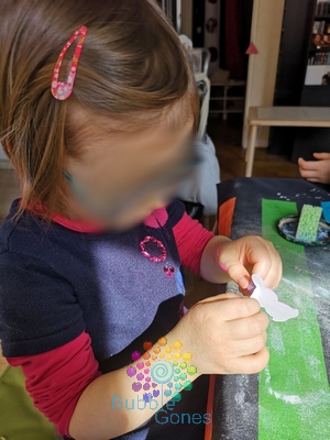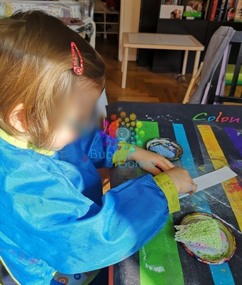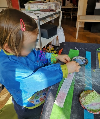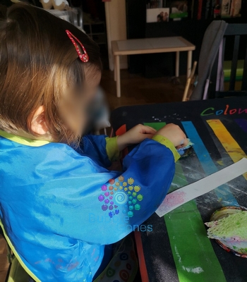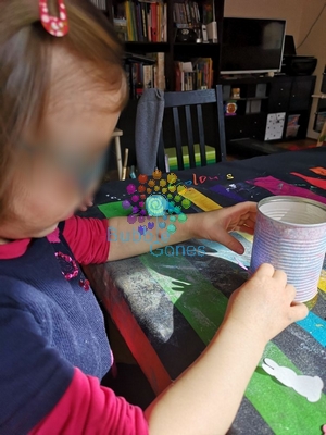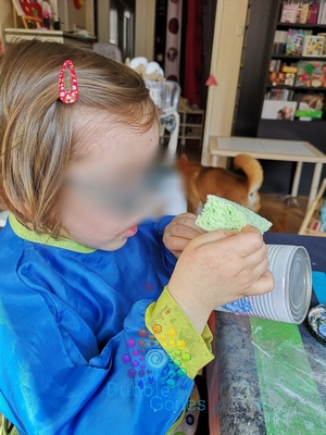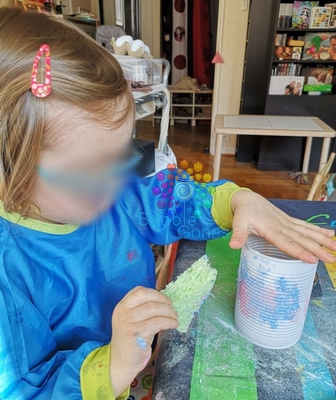 J’ai préparé la peinture et un morceau d’éponge pour qu’elle puisse l’appliquer. Mademoiselle A a déposé les différentes couleurs sur le pot de peinture avec l’éponge. Au départ je tenais le bol :