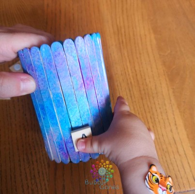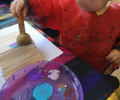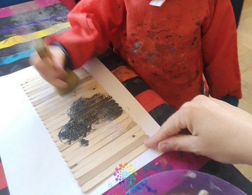 J’ai mis les bâtonnets de bois sur un set de table (attention à bien les retourner par rapport au scotch). Les garçons ont choisi leur couleur maîtresse pour les bâtonnets et j’ai choisi deux autres couleurs associées.