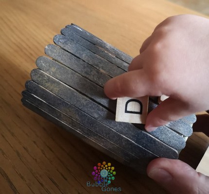 J’ai mis un carré de mousse au dos de la lettre et les garçons les ont collé sur les bâtonnets de glace.