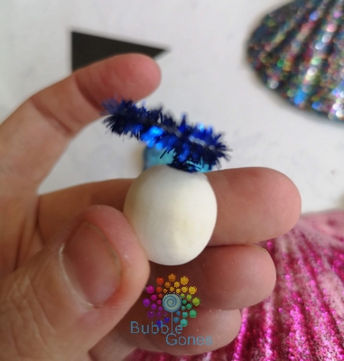 Pour créer l’auréole, j’ai entouré le fil autour de la perle pour lui donner une forme ronde. J’ai raccourci ce cercle pour qu’il soit un peu plus petit que la perle. J’ai laissé une tige dépassée afin de pouvoir l’insérer dans la perle. J’ai mis de la colle chaude dans le trou et j’ai mis l’auréole :