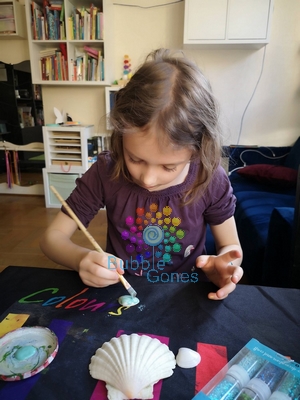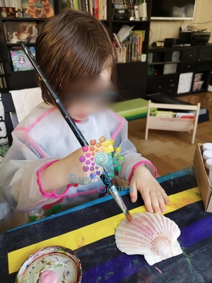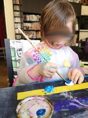 J’aime proposer aux filles des manières de peindre différentes (pinceau, tampon, fleurs, ballons…) mais aussi peindre sur des matériaux différents.