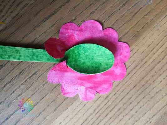 Quand la tige est sèche, je cache le manche de la cuillère avec une feuille pour que les garçons peignent l’ovale de la cuillère en jaune afin qu’il devienne le coeur de la fleur (je n’ai pas pris de photo, car j’avais les deux mains prises).