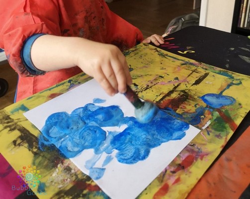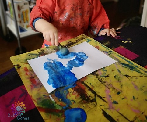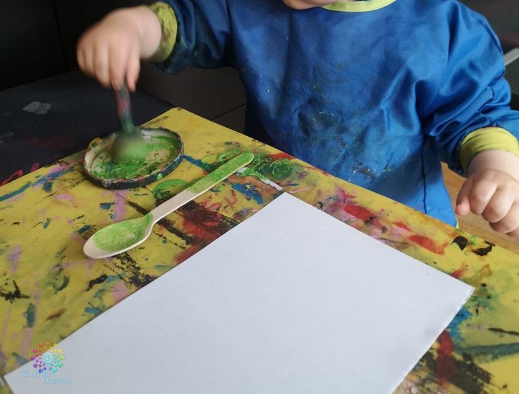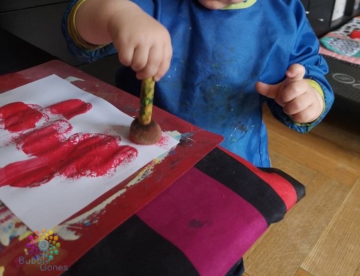 Ils commencent par peindre la cuillère en bois avec le tampon. Je leur indique avec le doigt où il manque de la peinture. Ils s’appliquent et je suis épatée de leurs progrès ces dernières semaines :