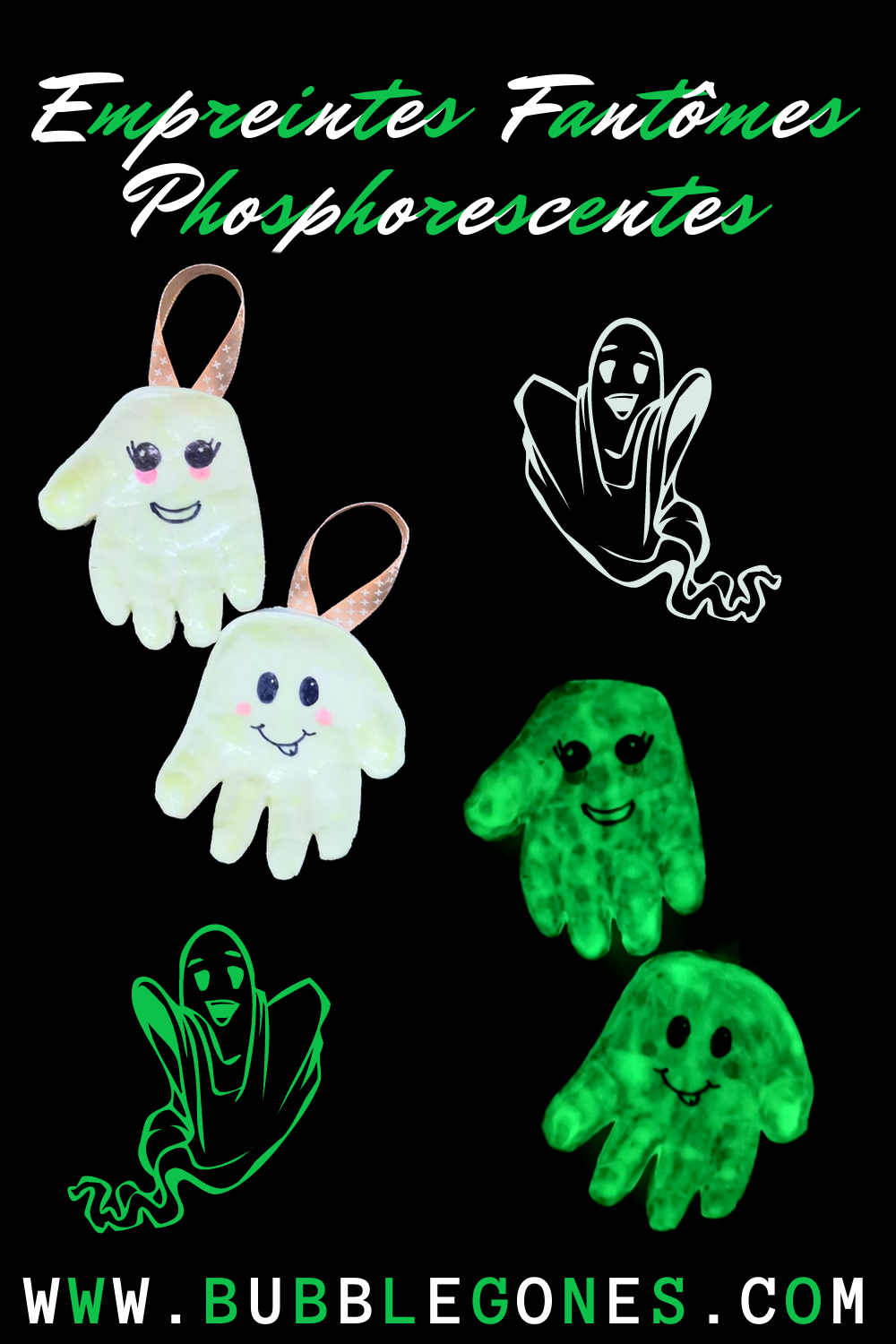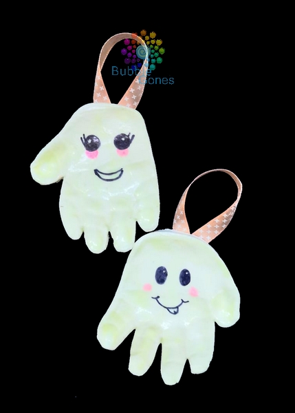 Ayant deux petits cette année, j’ai voulu réaliser un joli souvenir d’halloween en transformant l’empreinte de leur main en un joli fantôme phosphorescent.