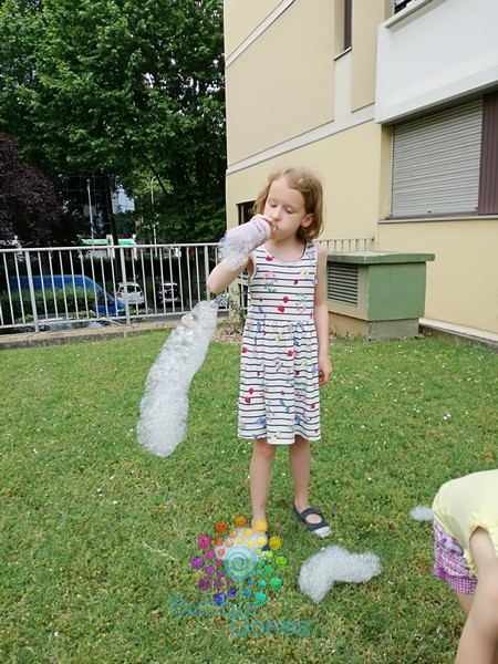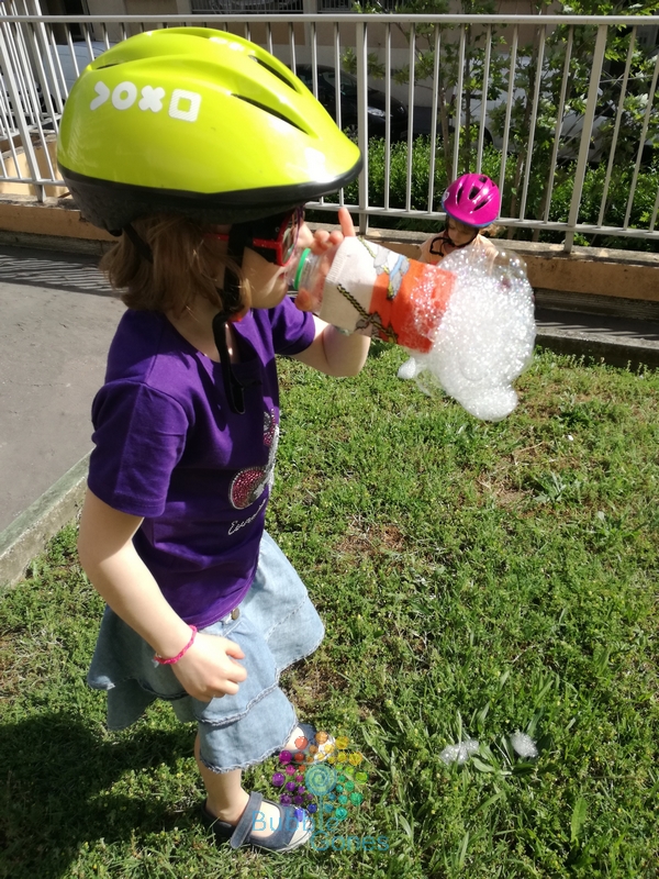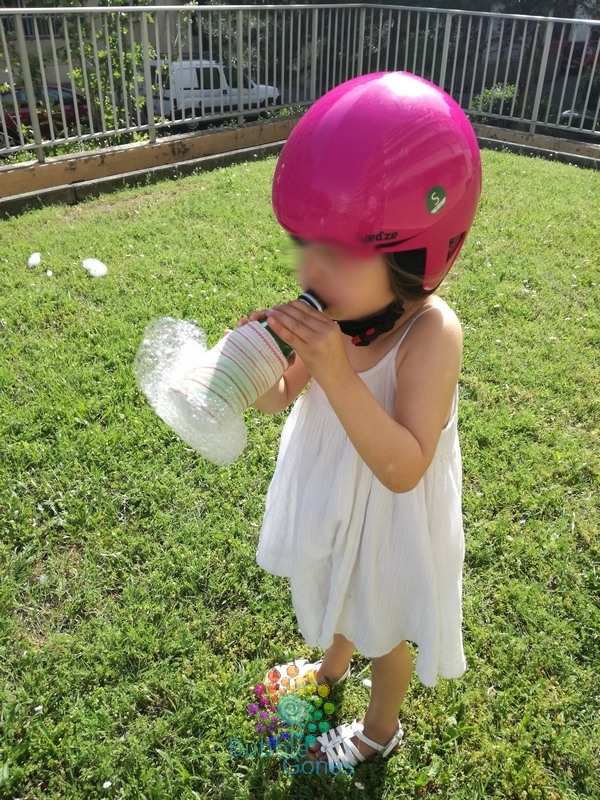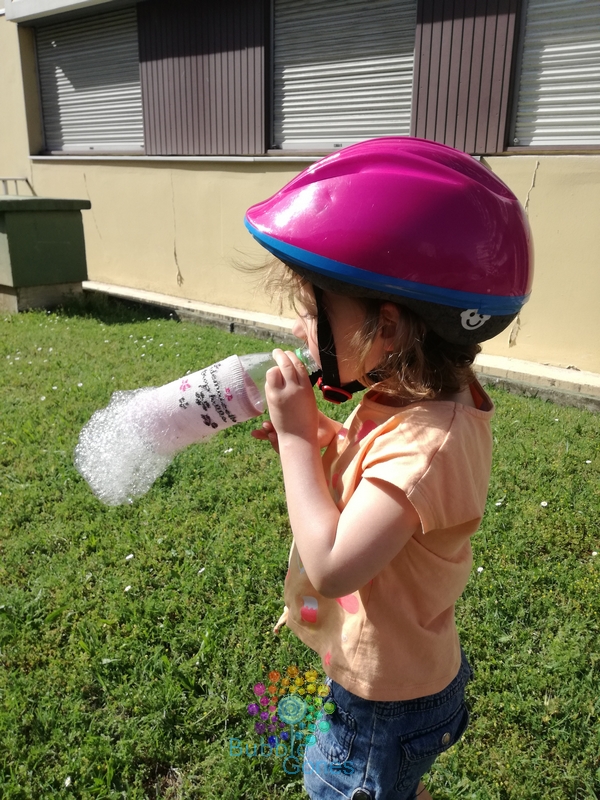 Les filles se regardent, intrigées et se lancent. Et là ce sont des explosions de joie devant les trompes d’éléphant qui se forment au bout de la bouteille !!! Hugo a pris de sacrés fou rires en voyant les bulles s’envoler ! Les filles ont adoré, moi un peu déçue car j’ai eu des mini trompes ! Mais bon tout le monde a adoré !