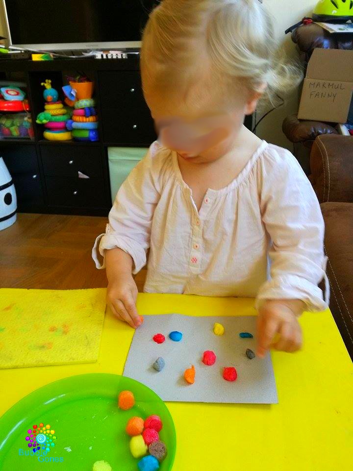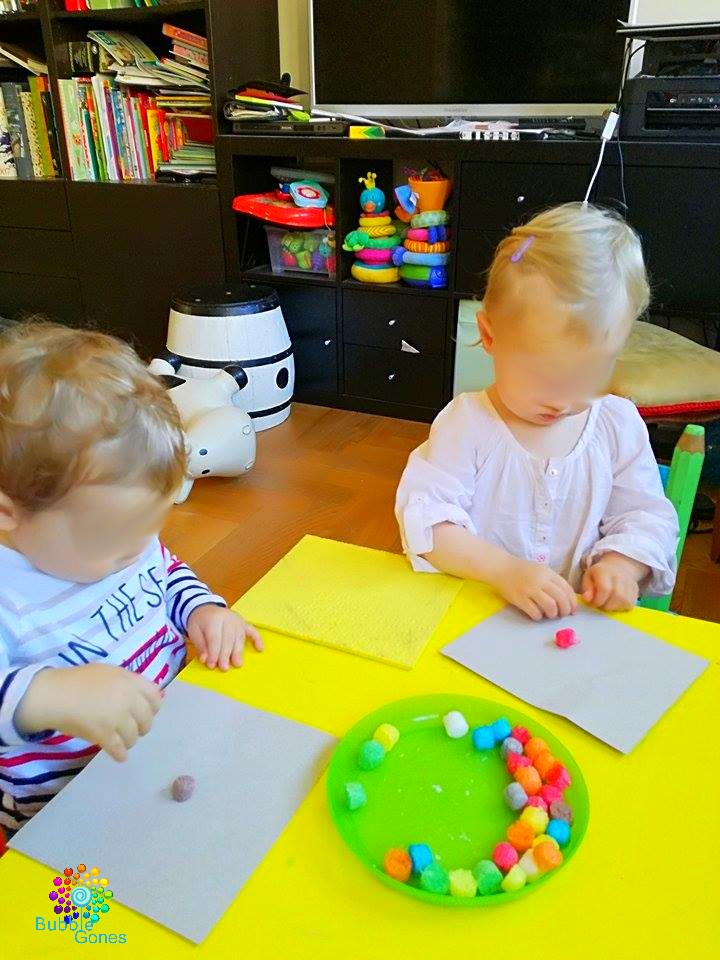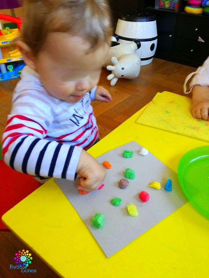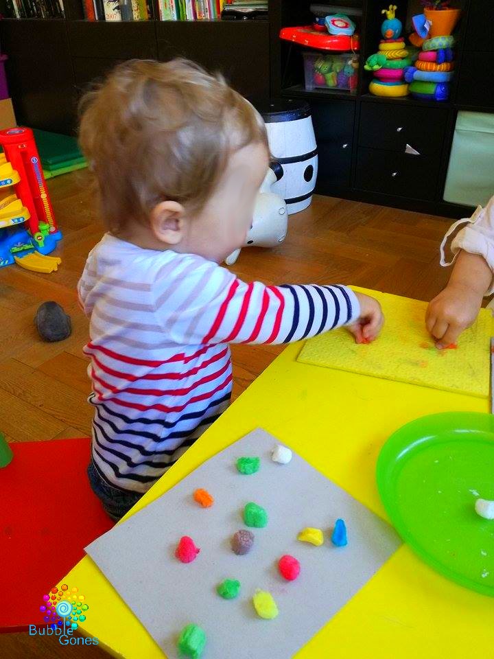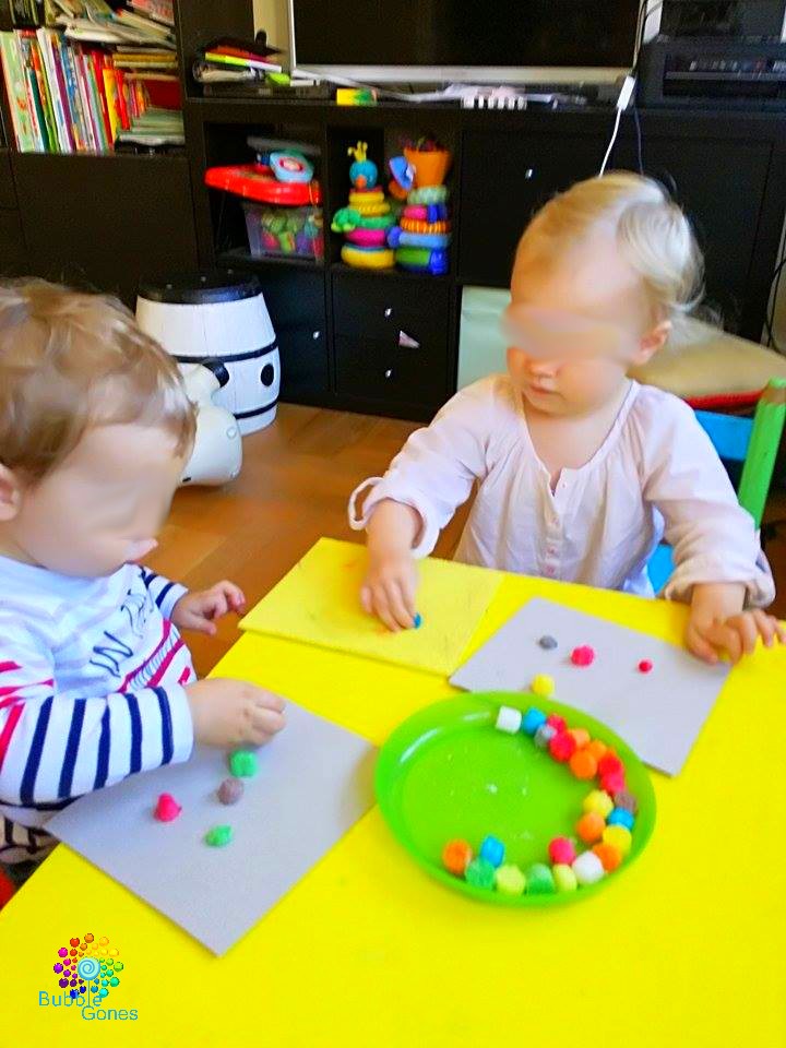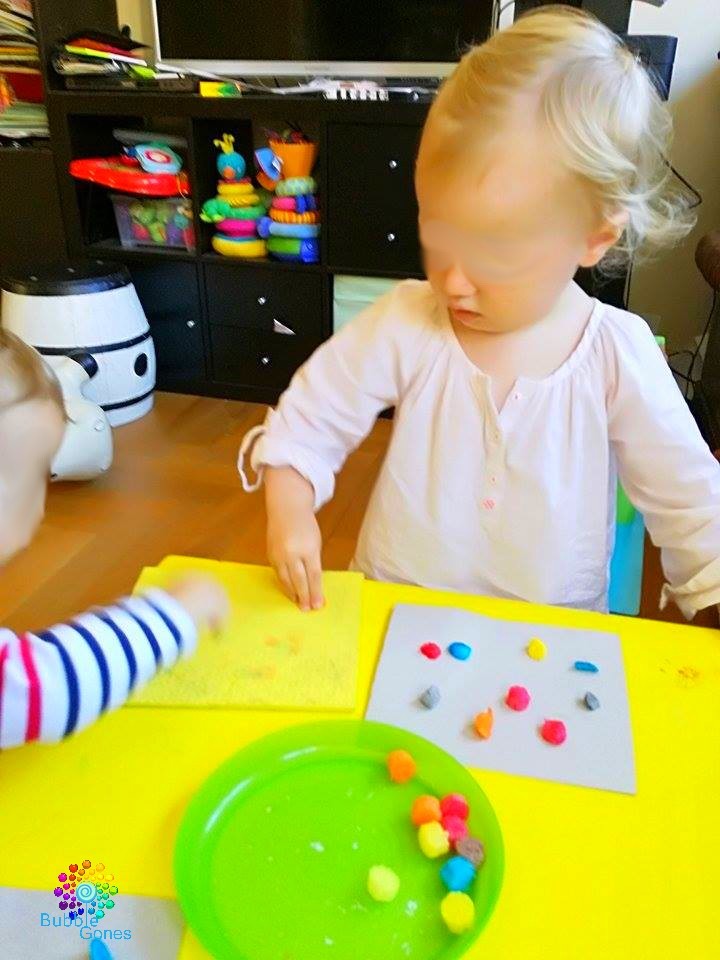 Je leur ai montré comment faire pour coller le playmais sur la feuille. Ils ont tout de suite compris. Bon ils ont bien appuyé pour que ça colle, déformant légèrement le playmais. Ils ont même tenté de les décoller une fois collé. Mais ils n’ont pas essayé de les manger, et ça c’est une excellente chose (bien que les playmais ne soient pas toxiques).